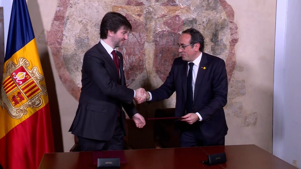 JUDIT PUJOL (Andorra la Vella).- El president del Parlament de Catalunya, Josep Rull, i el síndic general d’Andorra, Carles Ensenyat, han signat aquest dilluns a la Casa de la Vall un memoràndum de col·laboració que estableix un marc de relacions formals, amb l’objectiu de compartir experiències i tirar endavant temes transfronterers com la salut, les infraestructures, l’acció climàtica, i la política lingüística.