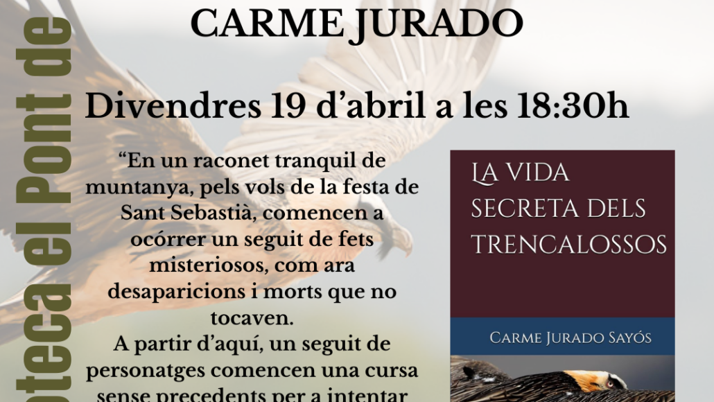 REDACCIÓ.- (Pont de Suert).- Aquest divendres, l’escriptora Carme Jurado presentarà la seva novel·la La vida secreta dels Trencalossos a la biblioteca de Pont de Suert, una obra ambientada a la capital de l’Alta Ribagorça durant la festa de Sant Sebastià.