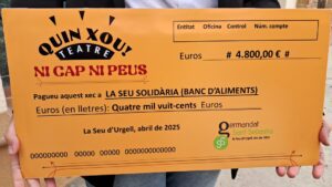 JUDIT PUJOL (La Seu d’Urgell).- Quin Xou Teatre i la Germandat de Sant Sebastià han lliurat un xec per valor de 4.800 euros a l’ONG local La Seu Solidària. La tinent d’alcalde i regidora d’Acció Social de l’Ajuntament urgellenc, Christina Moreno, ha estat l’encarregada de recollir la donació, que es destinarà íntegrament al banc d’aliments del municipi.