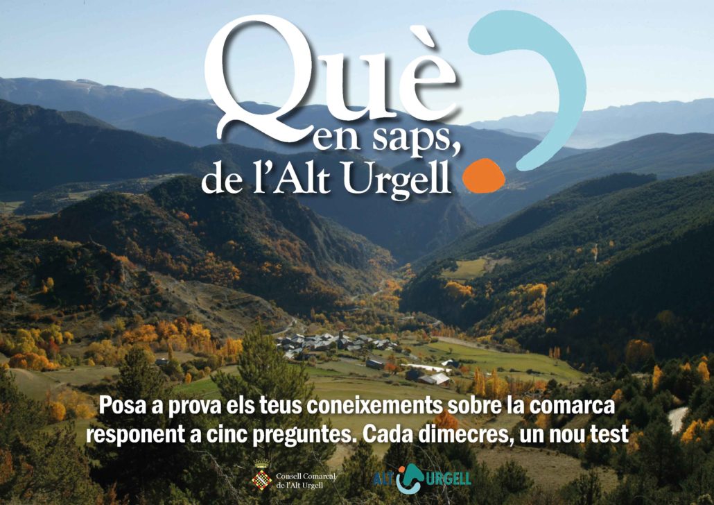 REDACCIÓ (La Seu d’Urgell).- El Consell Comarcal de l’Alt Urgell ha posat en marxa aquest dimecres, 15 de febrer, el joc en línia “Què en saps, de l’Alt Urgell?”, una iniciativa per donar a conèixer la comarca d’una manera lúdica i amena. Cada dimecres apareixerà al web de la institució un nou test, de cinc preguntes, que s’anirà acumulant als de les setmanes anteriors, de manera que en qualsevol moment es podrà tenir accés a tots els tests publicats.