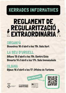REDACCIÓ (La Seu d’Urgell).- El Servei de Ciutadania i Migracions del Consell Comarcal de l’Alt Urgell ha programat quatre sessions informatives adreçades a la ciutadania de la comarca per donar a conèixer el nou reglament de regularització extraordinària per a persones migrades. Aquesta iniciativa és organitzada i impulsada pel mateix servei, amb la col·laboració de Càritas i Creu Roja.