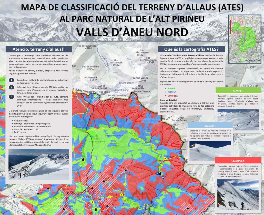 REDACCIÓ.- El Parc Natural de l’Alt Pirineu disposarà d’un mapa ATES (Avalanche Terrain Exposure Scale). Es tracta d’una tecnologia que avalua com de propens és el terreny a estar afectat per allaus. La cartografia ATES és la representació gràfica d’aquesta escala sobre mapa on es delimita el terreny d’allaus en tres classes: simple, exigent i complex.