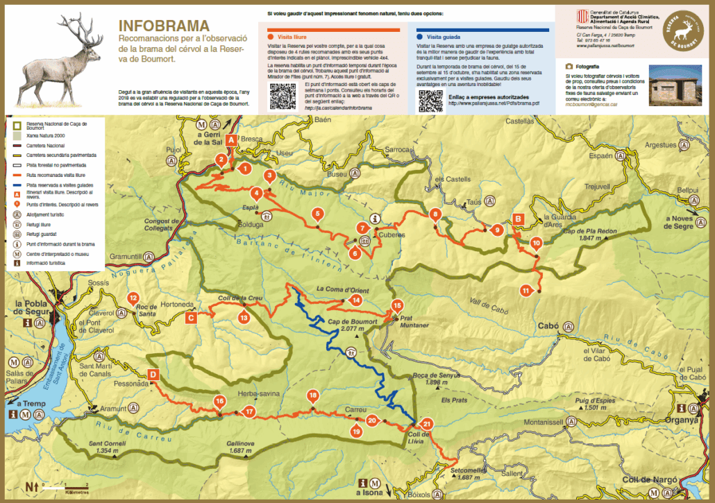En aquest sentit, des de la Reserva Nacional de caça del Boumort, cada s’edita l’Infobrama, un document que conté recomanacions per a l’observació de la brama, els accessos pels quals es permet passar, els que queden tallats, les zones d’observació recomanades, l’opció de visites lliures o guiades i fins i tot hi ha detallades les espècies animals més destacades que es poden trobar.