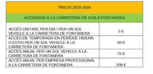 Taxes 2025 / 2026 per a l’accés a Fontanera / Aj. de Guils de Cerdanya