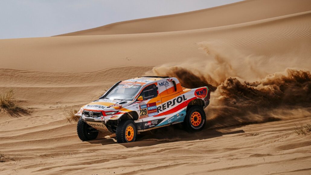 JUDIT PUJOL (Dakar).- Isidre Esteve lluita pel Top 20 absolut al Dakar. El pilot d’Oliana, que participa per 20a vegada a la competició, ha fet el millor resultat parcial, i amb el Repsol Toyota Rally Team ha aconseguit la 19a posició a la classificació general en la novena etapa. L’equip ocupa el mateix lloc en la categoria Ultimate, a només 22 minuts del primer.
