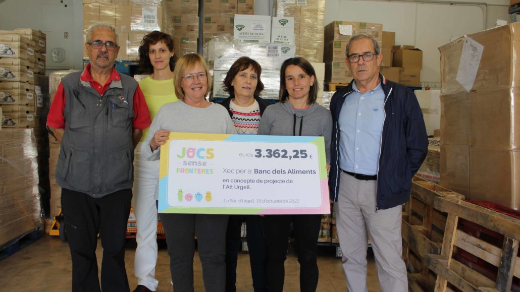 REDACCIÓ (La Seu d’Urgell).- L’ONG Jocs sense Fronteres ha lliurat aquest dimarts al migdia un donatiu de 3.362,25 euros al projecte Aliments per la Solidaritat de l’Alt Urgell. El donatiu l’han lliurat Yolanda Castillejo i Josep Triquell, membres d’aquesta ONG, que han fet a mans a la representant de l’Ajuntament de la Seu al Consorci d’Atenció a les Persones de l’Alt Urgell, Marian Lamolla.