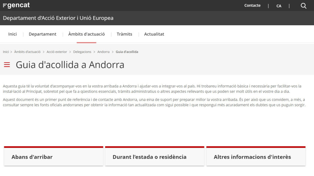 REDACCIÓ. (Andorra).- La Delegació del Govern de la Generalitat de Catalunya a Andorra (DGAD) ha editat una guia d’acollida dirigida als catalans que tinguin previst instal·lar-se al Principat. El document recull informació bàsica i necessària per facilitar el procés d’arribada i integració al país. Així, s’hi detallen qüestions essencials a tenir en compte, informació general del país, els principals tràmits administratius que cal realitzar o altres aspectes rellevants que poden ser d’utilitat tant en el procés previ a l’arribada com en el moment d’arribar i també un cop es resideix o es treballa al país.