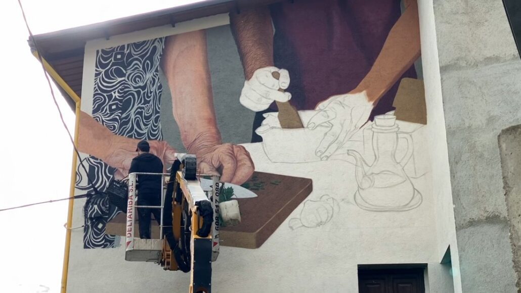 JUDIT PUJOL (La Seu d’Urgell).- El nou mural de Castellciutat representa una escena a la cuina d’una àvia i el seu net mentre preparen una picada d’all i julivert. La proposta, en el marc del projecte Castellciutart, recull les arrels de Cal Poblador, la casa on s’ha ubicat la pintura. L’escena rememora una de les tradicions més instaurades de la família, la matança del porc.