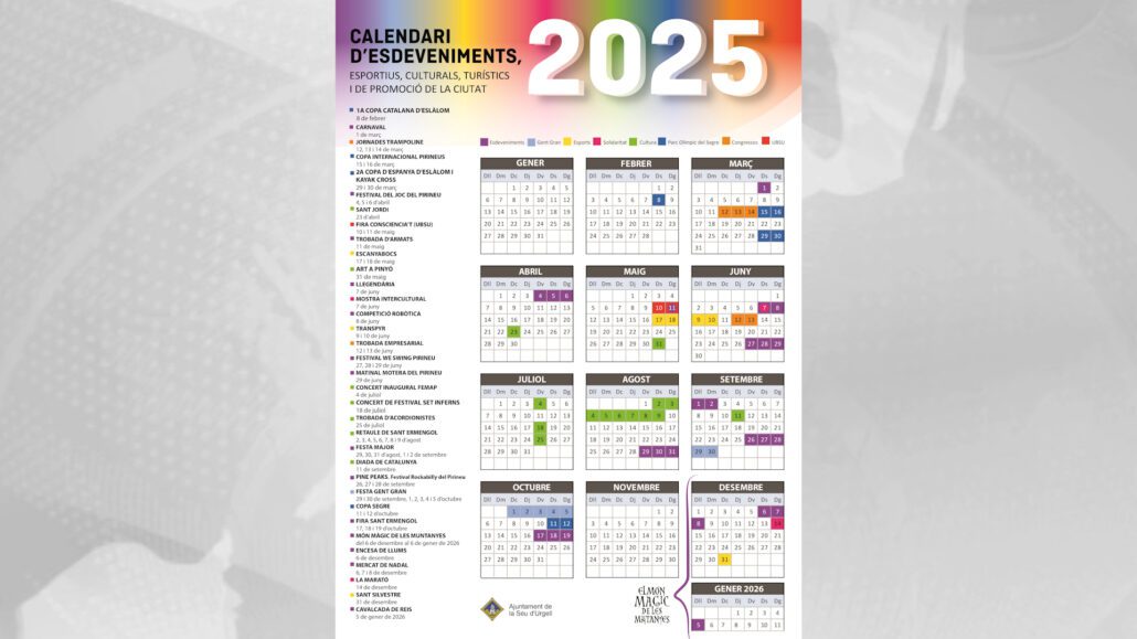 JUDIT PUJOL (La Seu d’Urgell).- L’Ajuntament de la Seu d’Urgell ha creat un calendari que recull els esdeveniments més destacats que tindran lloc durant el 2025. Les diferents propostes, classificades per colors, agrupen activitats culturals, esportives, turístiques i de promoció de la ciutat.