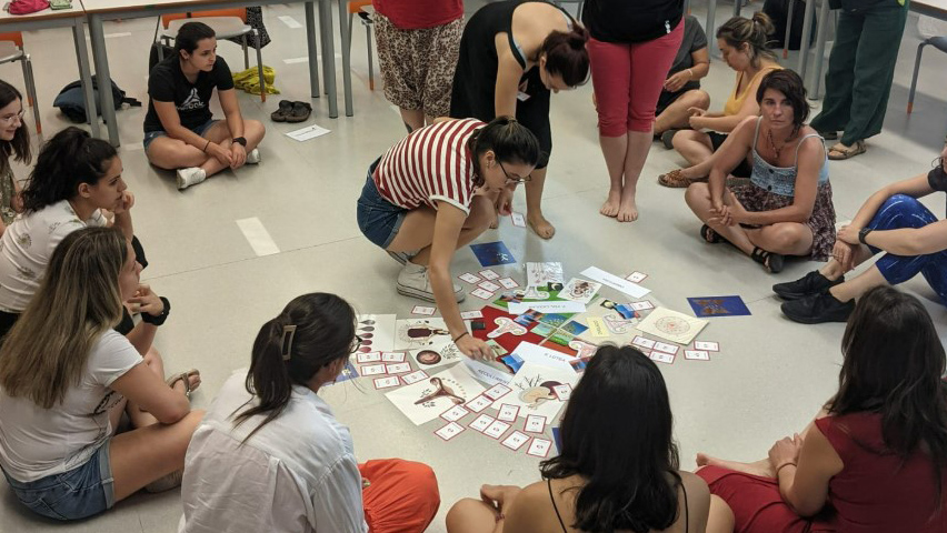 Noies i dones, assegudes en una sala, jugant a un joc de cartes
