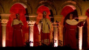JUDIT PUJOL (La Seu d’Urgell).- La 50a edició del Retaule de Sant Ermengol, a la Seu d’Urgell, encara la recta final de representacions, que finalitzaran aquest dissabte, 9 d’agost. L’espectacle teatral, que té lloc al claustre de la catedral, repassa alguns episodis de la vida del bisbe en diferents quadres.