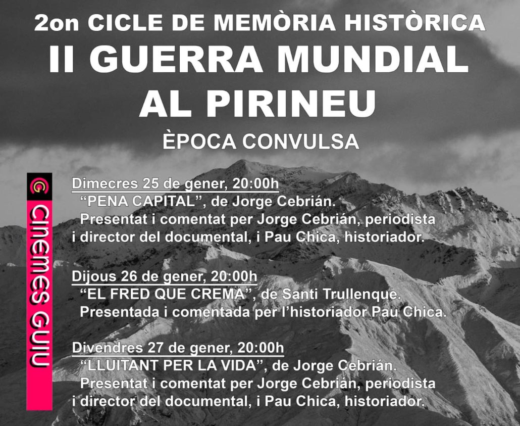 REDACCIÓ (La Seu d’Urgell).- El pròxim 25 de gener començarà la segona edició del Cicle de Memòria Històrica, organitzat per cinemes Guiu, que abordarà el període de la Segona Guerra Mundial al Pirineu. El cicle comptarà amb la pel·lícula recentment estrenada, “El fred que crema” de Santi Trullenque, i amb dos documentals premiats i dirigits per Jorge Cebrián, “Pena Capital” i “Lluitant per la vida”. Els dies de les projeccions també hi haurà una xerrada entre els directors i l’historiador Pau Chica.