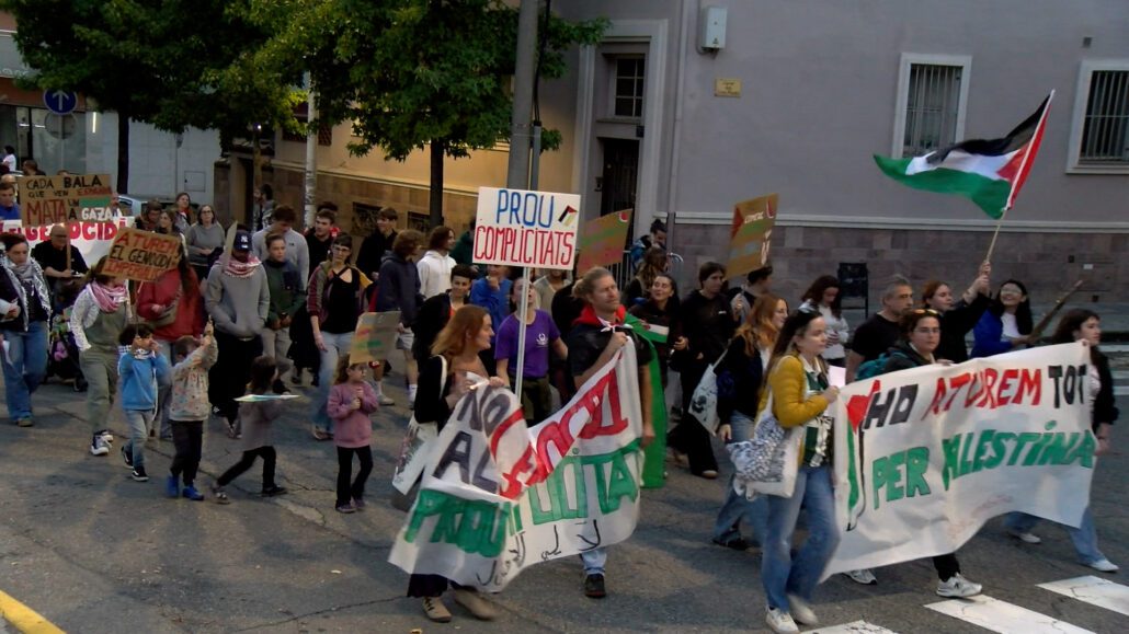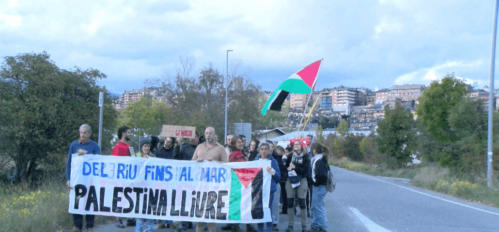 La marxa s’ha aturat a la rotonda on s’uneixen l’N-145 i l’N-260, per a tallar les vies momentàniament. L’objectiu ha estat fer visible la jornada de lluita, en el marc de la vaga general del 15 d’octubre, sota el lema ‘Ho aturem tot’.  I s’ha volgut remarcar que el Pla de Pau no acaba res: “amb el suposat Pla de Pau no s’acaba absolutament res i és important trencar el relat que la situació a Palestina comença amb els atemptats del 7 d’octubre. És important entendre que parlem d’una situació d’opressió i de colonialisme històrica, que està fent que faci més 75 anys que les palestines visquin malvivint i posant les seves vides en la línia de foc només pel fet d’existir”.