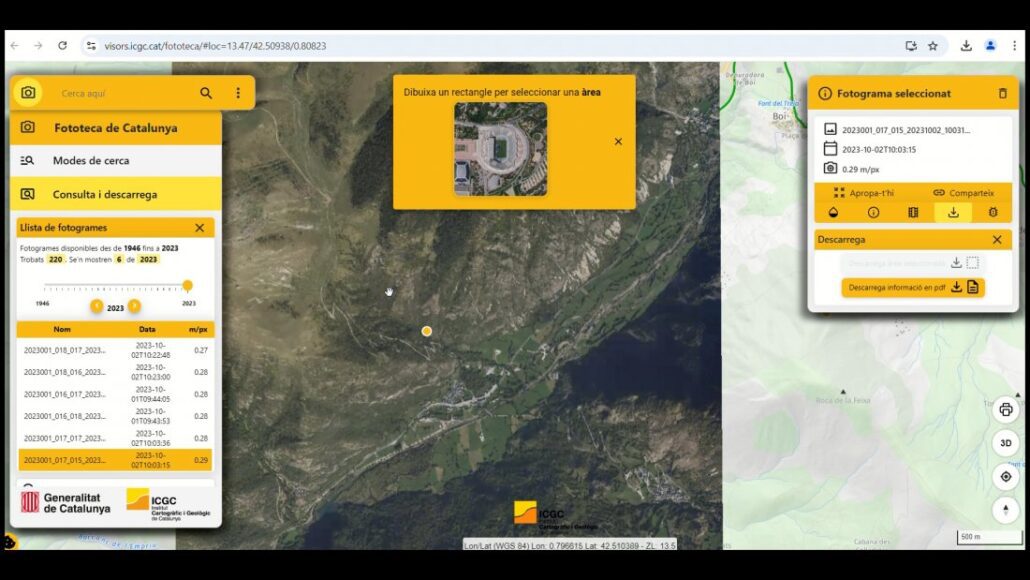 El visor de la fototeca incorpora una línia de temps i un menú que permet personalitzar de manera interactiva la cerca, accedir a la informació relacionada amb cada punt del nostre territori i descarregar els fotogrames consultats.