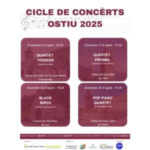 El primer concert serà aquest divendres, 8 d’agost, a l’església de la Mare de Déu del Roser d’Es Bòrdes, amb el Quartet Teixidor de corda, a les 20:00 hores. El Quartet de corda i flauta Prysma oferirà un ampli repertori a l’església de Sant Fèlix de Vilac el següent divendres, 15 d’agost, a les 19:30 hores. Una tercera actuació musical reunirà a l’espiritual quartet negre Black Birds a la capella de Sant Blai de Les, el divendres, 22 d’agost, a les 19:30 hores. I finalment, el cicle de concerts es clourà el divendres, 29 d’agost, amb el trio de corda i piano Pop Piano Quartet, a l’església de Sant Julià de Garòs.