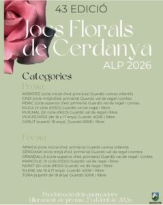 REDACCIÓ (Alp).- L’Ajuntament d’Alp ja ha publicat les bases de la convocatòria de la 43a edició dels Jocs Florals de Cerdanya. Un esdeveniment que any rere any promou el talent literari pirinenc tant en format prosa com poesia i per a totes les edats.