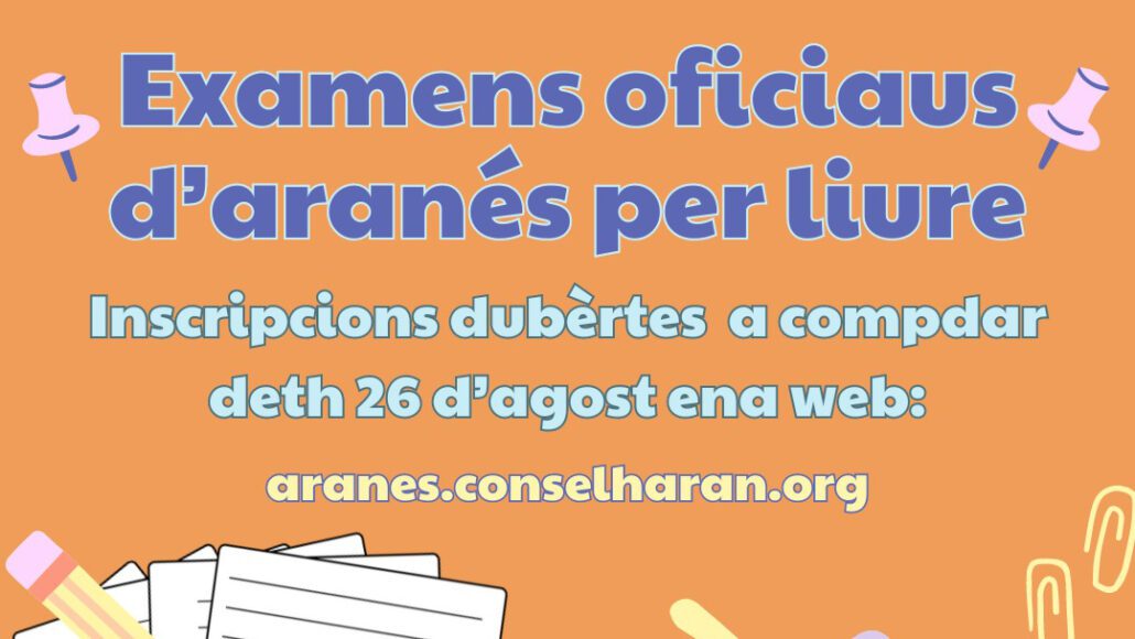 REDACCIÓ (Vielha).- Des del dilluns, 26 d’agost, i fins al divendres, 30 d’agost, s’obriran les sol·licituds d’inscripció per poder presentar-se per lliure a l’examen oficial d’aranès. En aquest enllaç del Conselh Generau (https://aranes.conselharan.org/corsi-daranes/) els interessats hauran d’emplenar el formulari per a posteriorment fer el pagament de la tassa d’examen, amb l’aportació del document justificatiu corresponent, si és necessari, o manar-lo adjunt amb la sol·licitud.