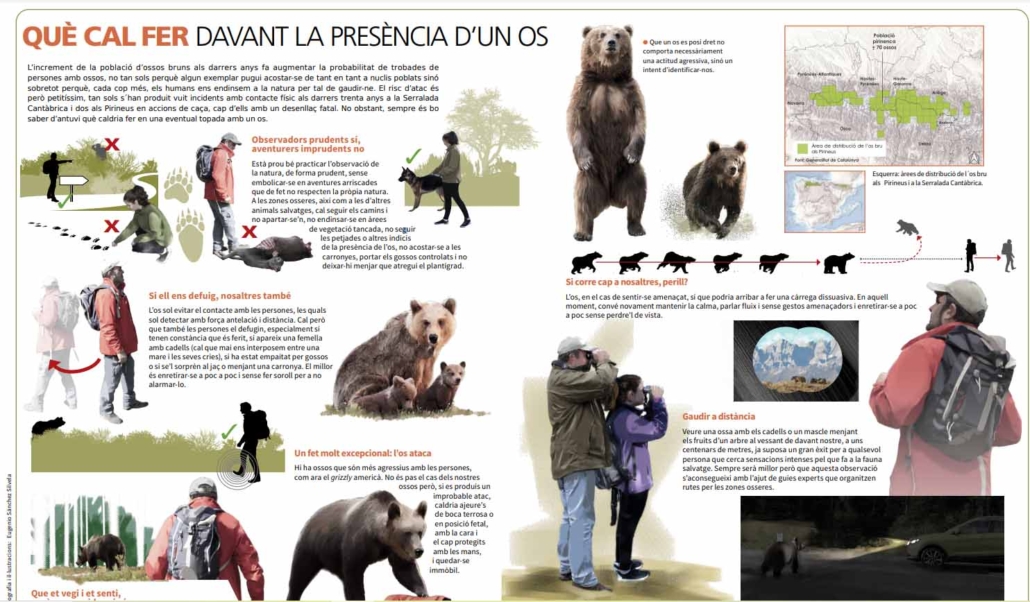 La Fundación Oso Pardo (FOP) ha repartit en centres de visitants del Parc Nacional d’Aigüestortes i Estany de Sant Maurici i al Parc Natural de l’Alt Pirineu, així com en diferents oficines de turisme, 5.000 làmines amb consells per saber com comportar-se a les muntanyes amb presència d’ossos, i millorar així la seguretat dels visitants i la dels ossos.