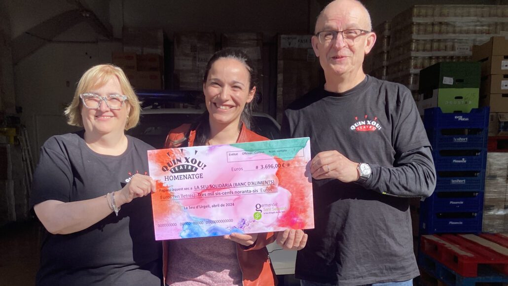 REDACCIÓ. (La Seu d’Urgell).- Aquest dijous una representació de la companyia urgellenca Quin Xou Teatre i membres de la Germandat de Sant Sebastià han lliurat un xec per un valor de 3.696€ a l’ONG local La Seu Solidària. La tinent d’alcalde d’Acció Social de l’Ajuntament de la Seu, Christina Moreno, ha estat l’encarregada de recollir aquest xec que es destinarà íntegrament al banc d’aliments del nostre municipi.