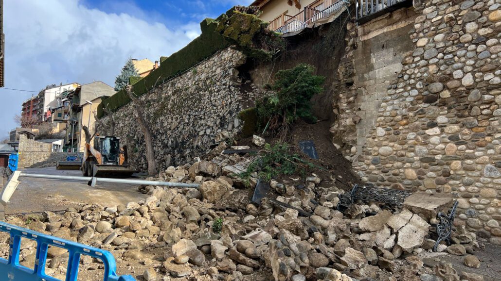MARIA FORMENTI (Puigcerdà).- Les pluges dels últims dies han provocat que aquest dilluns, a Puigcerdà, s’hagi esfondrat un mur de pedres, d’uns 10 metres d’alçada, que forma part de l’antiga muralla que protegia la vila. L’incident, que ha tingut lloc al carrer Beates, ha causat diversos danys materials però cap persona ha resultat ferida.