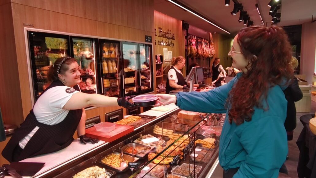 Lliurament d'un envàs reutilitzable en un dels comerços participants a la prova pilot./Aj. Tremp.