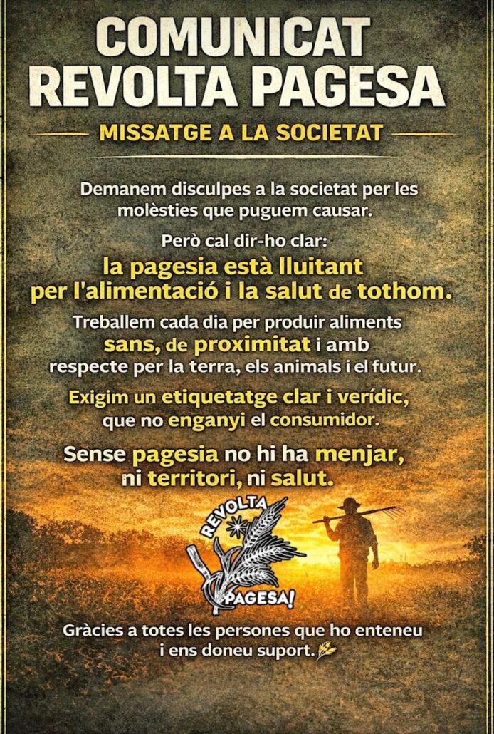 Aquest dijous al matí, Revolta Pagesa ha convocat talls i manifestacions en diferents carreteres catalanes per protestar per les gestions que el govern està fent en matèria d’agricultura i ramaderia i que posen en perill la viabilitat del sector. La pagesia catalana protesta contra les retallades a la Política Agrària Comuna, per l’acord entre la UE i Mercosur i la gestió que es du a terme de la crisi sanitària de la Dermatosi Nuclear Contagiosa.