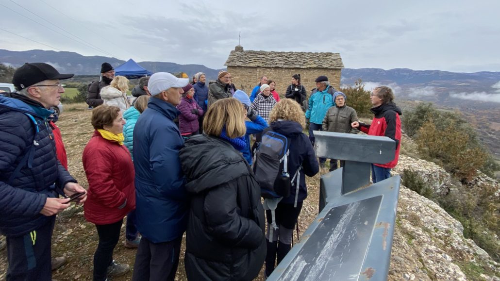JOFRE FIGUERAS DOY (Tremp).-Amb motiu del Dia Internacional de les Muntanyes que se celebra aquest diumenge 11 de desembre, l’Ajuntament de Tremp i el Geoparc Orígens han organitzat una caminada fins a l’ermita de Santa Elena de Claret. L’activitat ha comptat amb una trentena de participants, que han sortit a peu del Parc de Bombers de Tremp i han fet la pujada fins a la capella romànica, on s’ha fet un esmorzar amb productes de proximitat i una xerrada divulgativa sobre la formació de la serralada dels Pirineus.