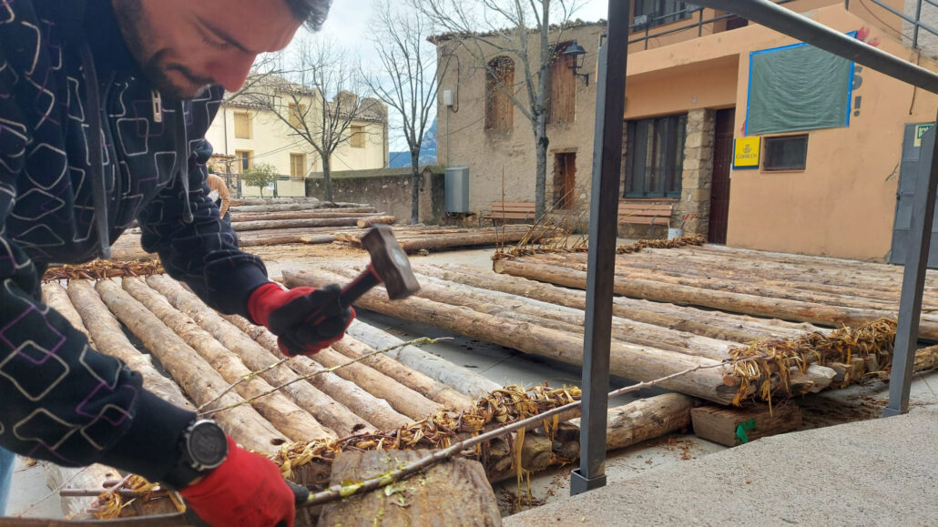JP.O. (Coll de Nargó).- L’Associació de Raiers de Coll de Nargó ultima els preparatius per la 35a edició de la Baixada, que tindrà lloc aquest dissabte, 30 de març. El cap de setmana abans, un grup de voluntaris va a Sant Joan de l’Erm a buscar bedoll. Aquest es porta a la plaça de l’Ajuntament, on es prepara per a poder lligar totes les bigues de cada tram. La idea, segons explica Josep Puig, vicepresident de l’Associació, és “recuperar tot el que es pugui de l’any anterior”. Aquest any però, han hagut de posar troncs nous, “unes 10-12 bigues”, continua Puig.