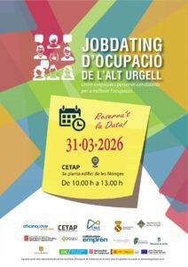 REDACCIÓ (la Seu d’Urgell).- El pròxim 31 de març, de 10 del matí a 1 del migdia, tindrà lloc al CETAP de la Seu d’Urgell, a la plaça de les Monges, una nova edició del Jobdating, la cita habitual que s’organitza des de l’àrea de Promoció Econòmica del Consell Comarcal de l’Alt Urgell per activar contractacions de personal especialment de cara a la temporada d’estiu, tot i que la jornada està oberta a qualsevol sector econòmic i tipologia de contracte.