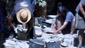 Una vintena d’estudiants aprenen al Meüll la tècnica de pavimentat de la pedra seca