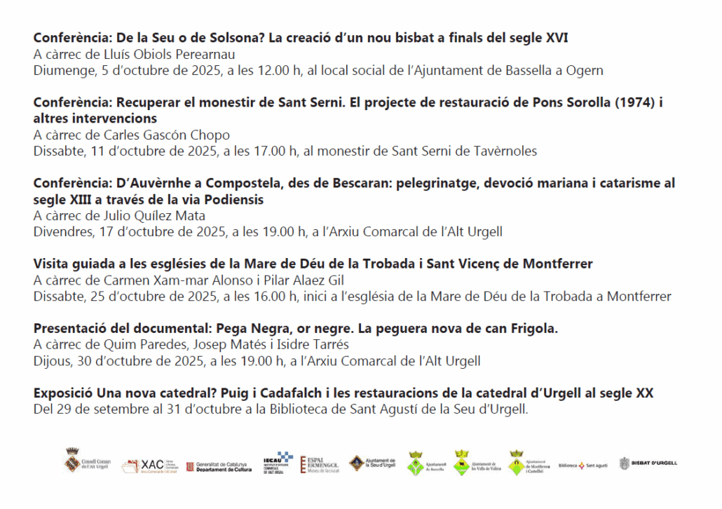 REDACCIÓ (La Seu d’Urgell).- Aquest diumenge 5 d’octubre comença una nova edició del cicle Desenterrant el passat, de la mà de l’historiador urgellenc Lluís Obiols Perearnau. Durant el mes d’octubre s’han programat dues xerrades més, una sortida guiada, la presentació d’un documental i una exposició.
