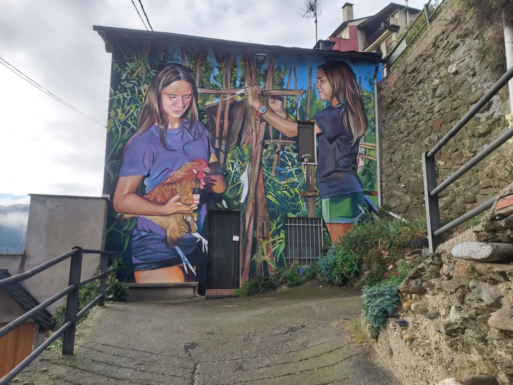 JUDIT PUJOL ODÉN (Castellciutat).- Castellciutat compta amb un nou mural, creat per la coneguda artista de Juneda, Lily Brick, que representa la presència femenina en entorns rurals. La pintura il·lustra les dues germanes de la casa, en l’hort de la família. Un dels elements centrals és una gallina, en homenatge a la padrina, que era una gran amant de la natura i d’aquest animal, en concret.