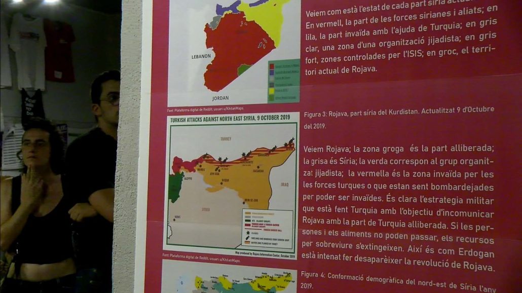 En l’acte d’inauguració de l’exposició s’ha projectat el documental ‘Kobane’. Aixecar-se’, dirigit per Domènech per explicar la realitat de la generació de joves que han conviscut amb la revolució de Rojava, l’any 2012, i els canvis socials que ha comportat. L’exposició mostra les vinculacions existents entre el poble kurd i català, el paper que han tingut les dones en la revolució de Rojava i la situació sociopolítica actual del país.